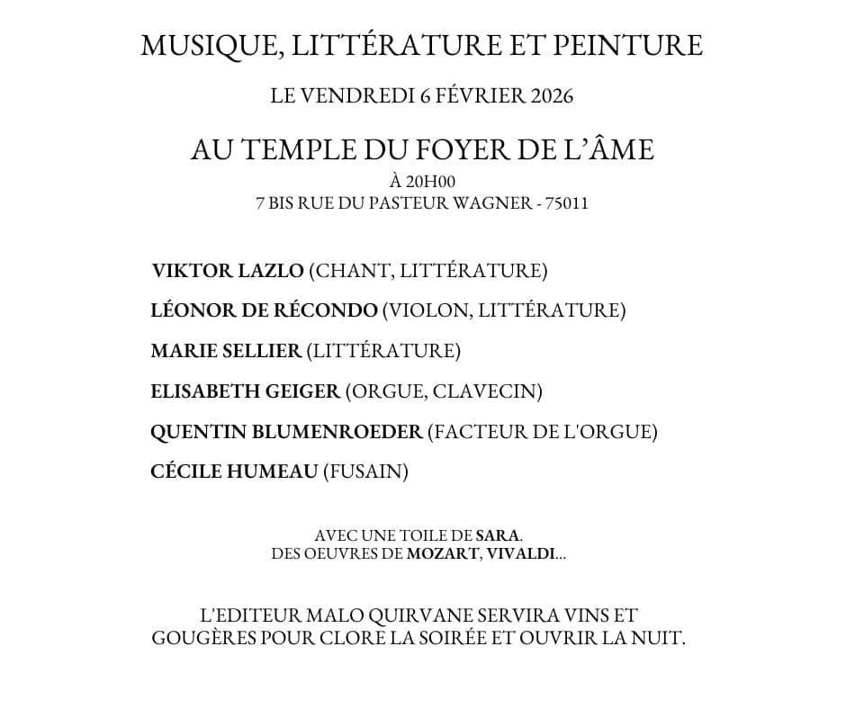 Venez, vous tous qui aimez les arts visuels, les armes littéraires et les lois musicales. Venez donc le 6 février dans le ravissant temple Art Nouveau que cache une banale façade du quartier de la Bastille. Venez boire du violon, du clavecin, de l’orgue. Venez manger une peinture à l’huile, un papier déchiré, deux fusains. Venez écouter le vin couler dans les verres et regarder craqueler les gougères ou les fougasses. Venez car Elisabeth Geiger, Léonor de Récondo et Viktor Lazlo, Cécile Humeau, Quentin Bluemenroeder et Marie Sellier, vous proposent ce moment hors du temps, hors du monde, au cœur de Paris. Dans un lieu où la spiritualité invite les arts, le Temple du Foyer de l’âme, nous nous souviendrons de la joie commune qui surgit toujours malgré les peines et les ravages. D’ailleurs, nous ne seront pas seuls, entre vivants. Il y aura Vivaldi et Mozart, qui prendront vie sous les archers, grâce aux cordes vocales. Et il y aura Sara (1950-2023), sans qui la maison de négoce littéraire n’existerait pas. Car elle l’a enfanté deux fois : en lui offrant son graphisme si pur, si simple, en portraiturant le sieur Malo Quirvane. Et en disant à Edith de Cornulier de poursuivre la maison Quirvane sans relâche quand elle ne serait plus là. Quelques jours après, elle n’était plus là et elle était là plus que jamais. Car jamais n’est que l’autre versant de toujours. Pour toujours.
